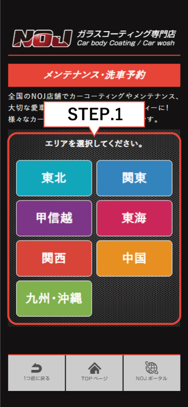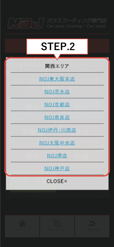 例)関西をタップすると関西にあるNOJの店舗一覧が表示されます。